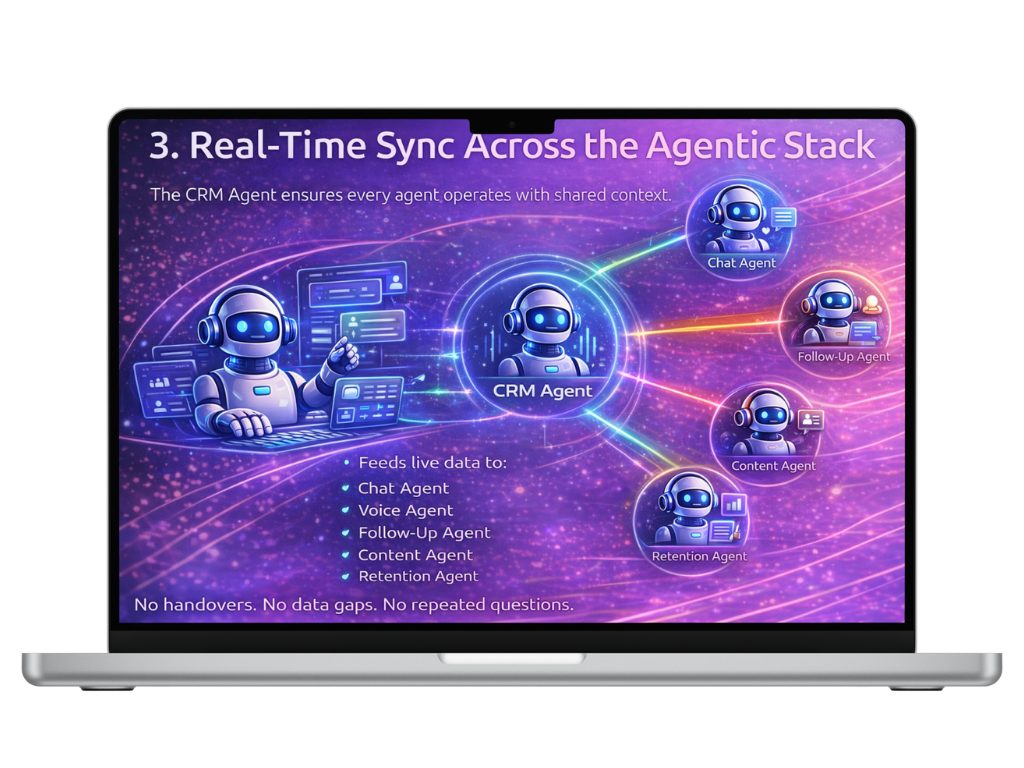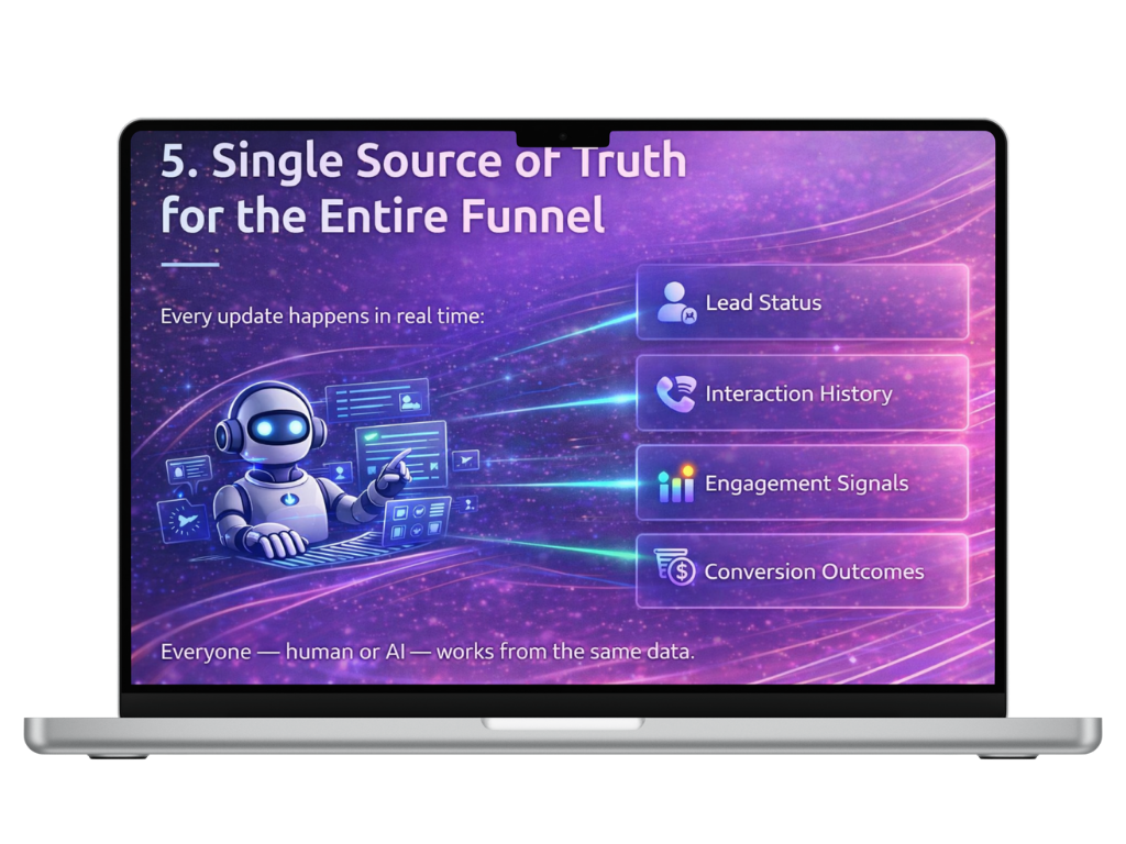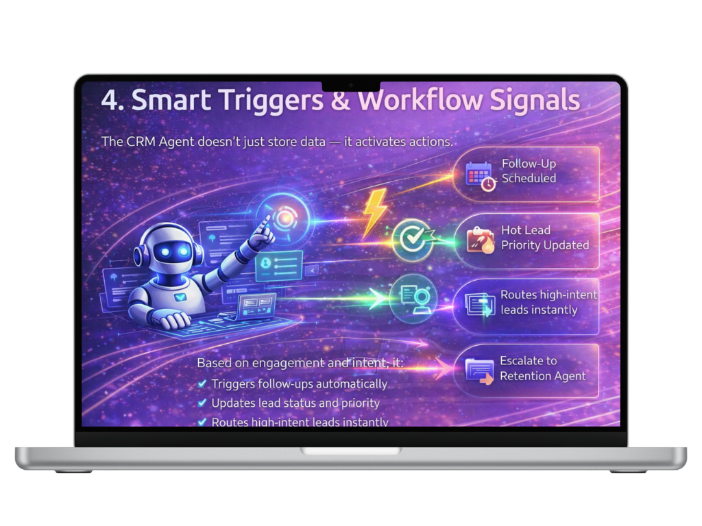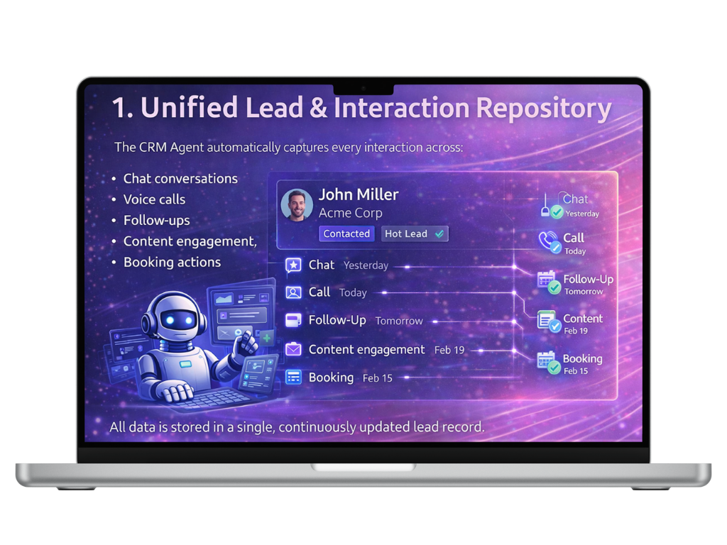 The CRM Agent unifies all lead and interaction data into a single, real-time system. It automatically captures, cleans, and updates records across every channel.