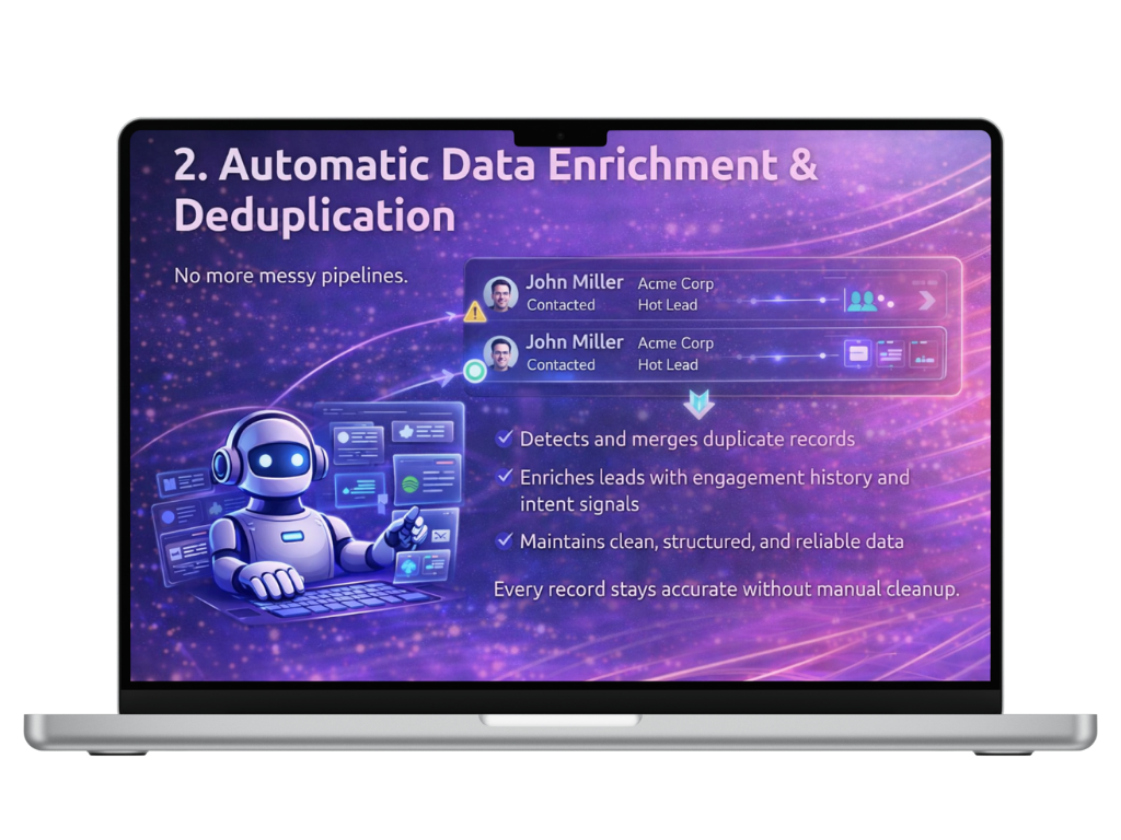 It can work alongside or enhance your existing CRM by handling data synchronization, deduplication, and enrichment automatically.